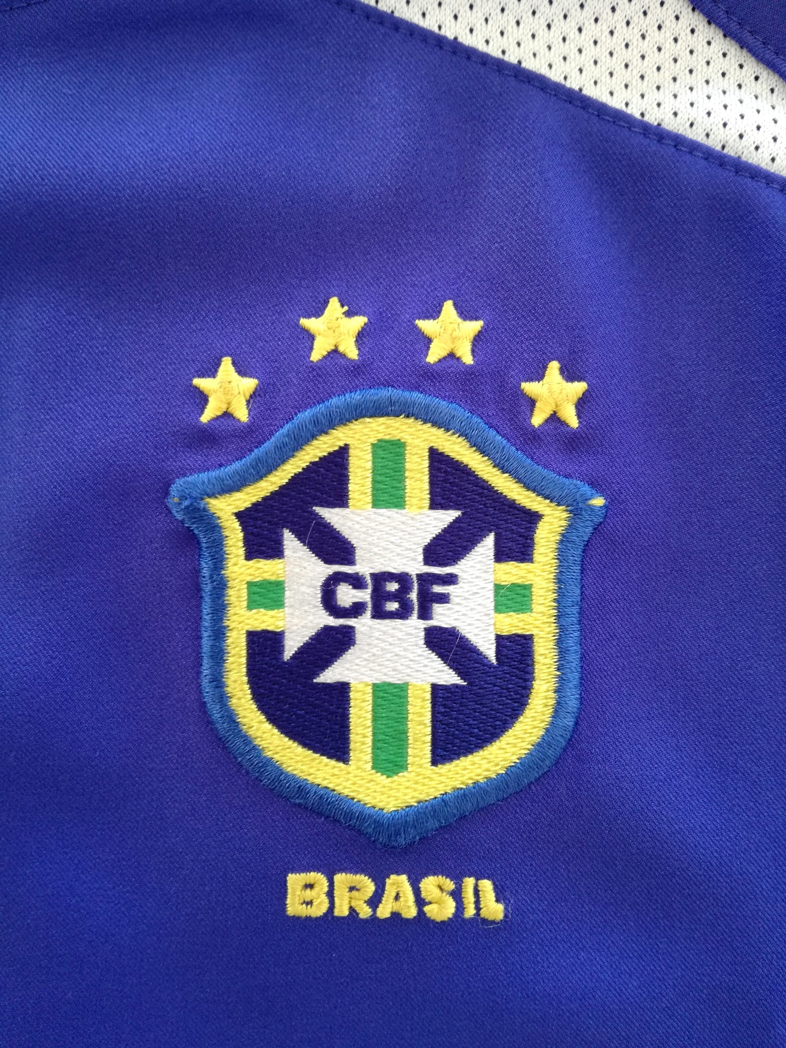 This is the rarer '4 stars' version of the jersey, manufactured before Brazil lifted their 5th World Cup in the summer of 2002. Jerseys manufactured after this tournament, featured five stars above the crest.