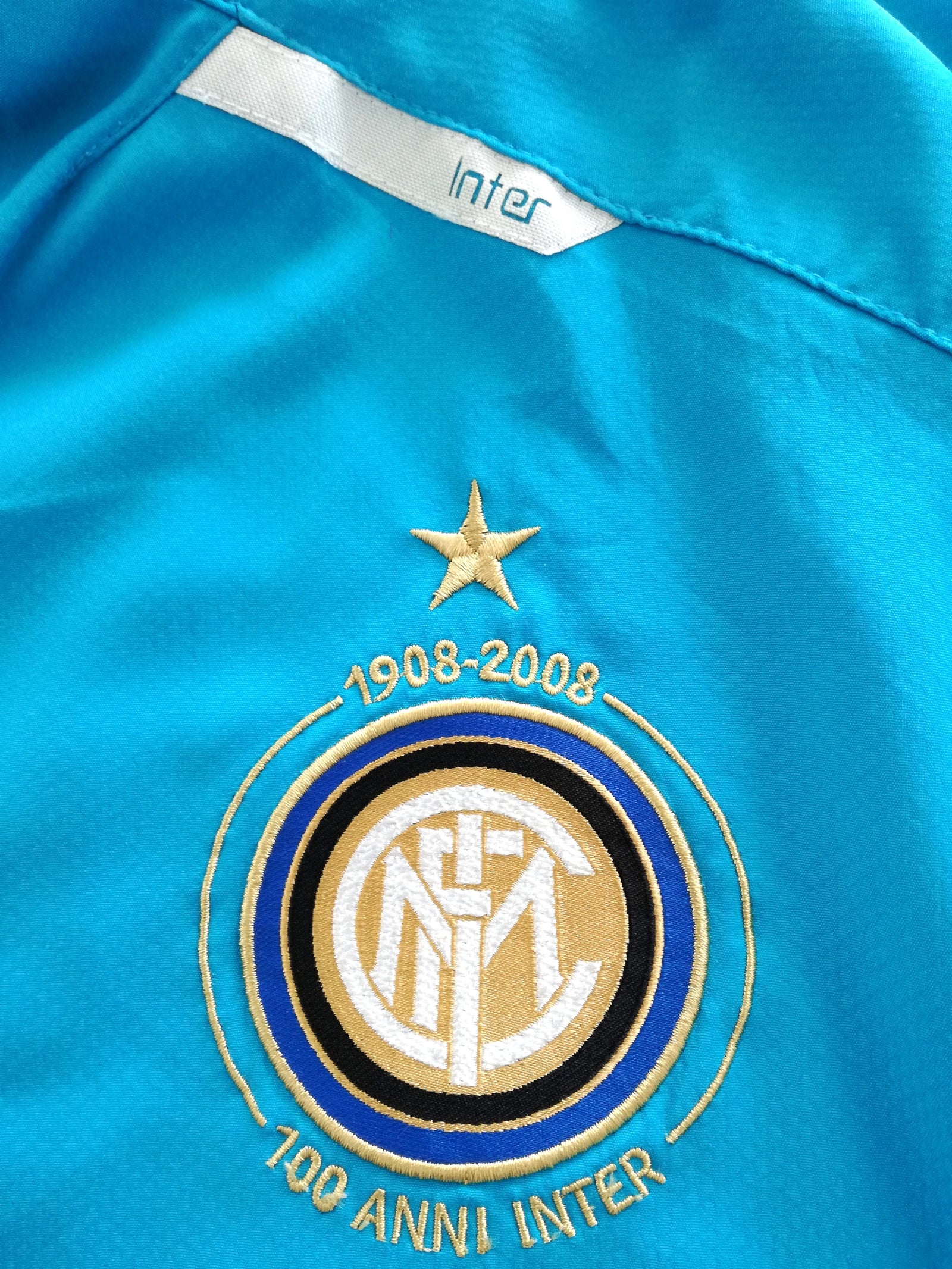 Official Nike Inter Milan full zip, long sleeved football training track jacket from the 2007/08 season. This jersey commemorated the club's 100th year with anniversary details around the crest.