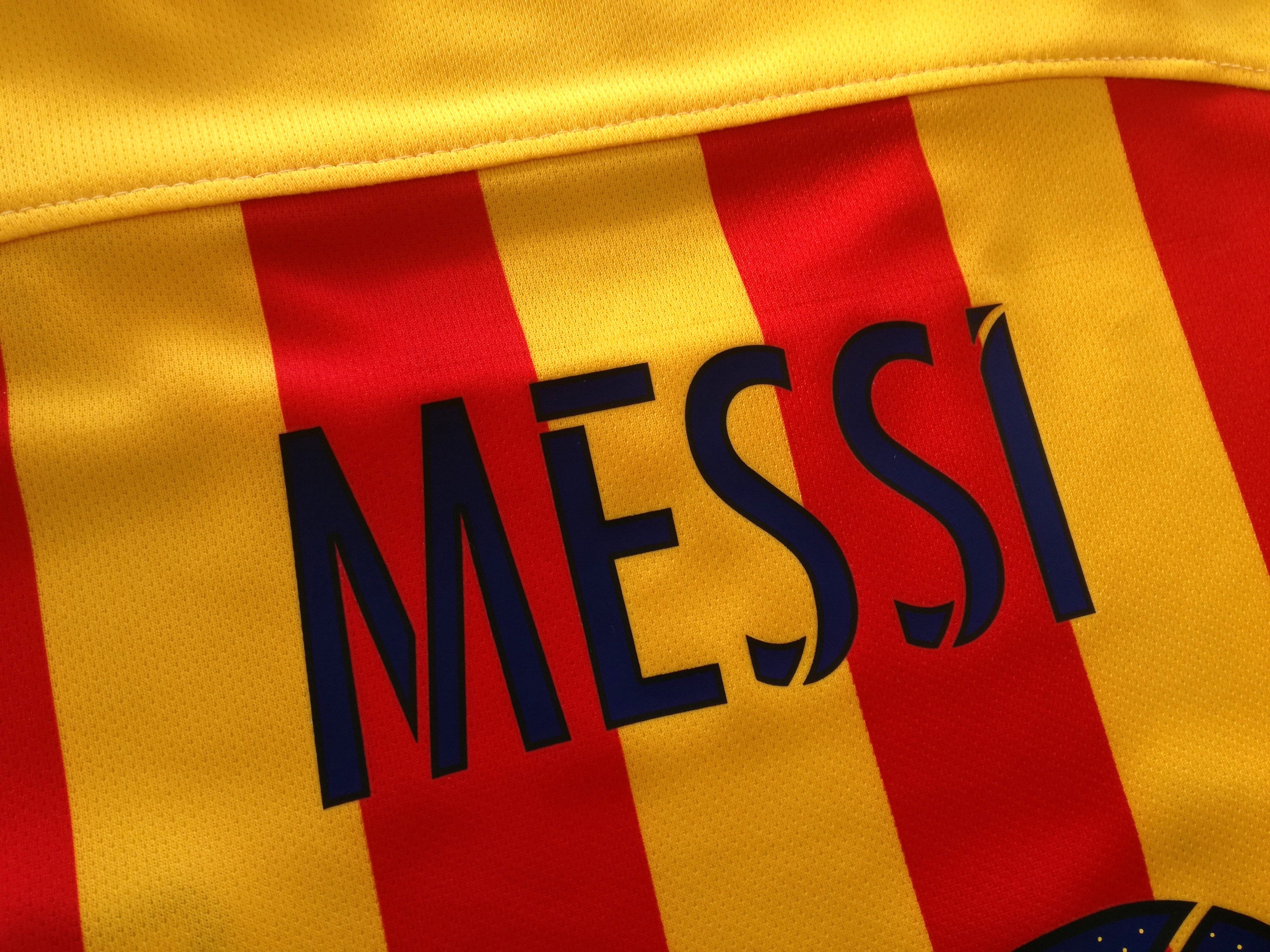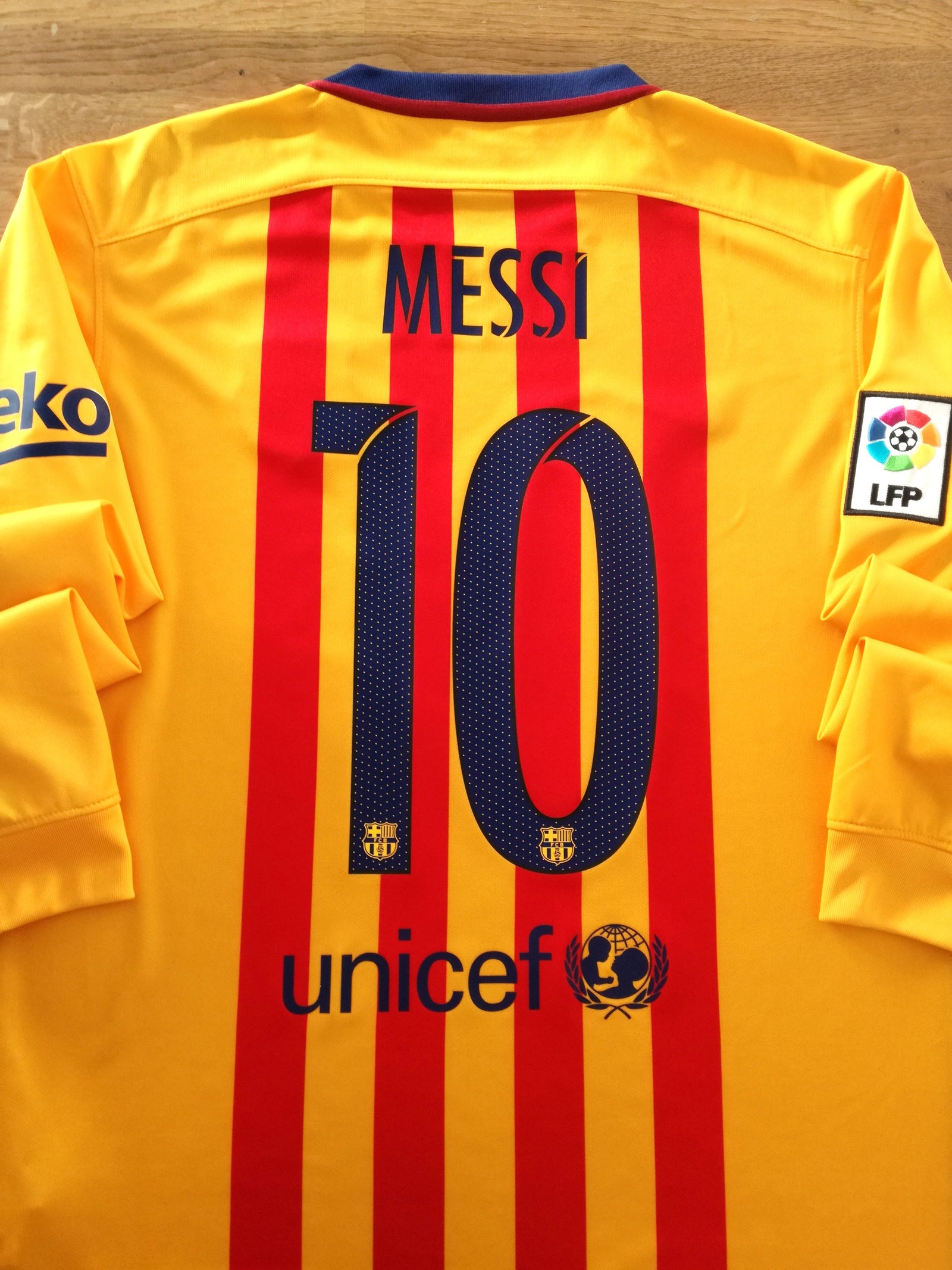 Official Nike Barcelona away long sleeve football shirt from the 2015/16 season. Complete with Messi #10 on the back of the shirt in official lettering and original La Liga patch on the sleeve.