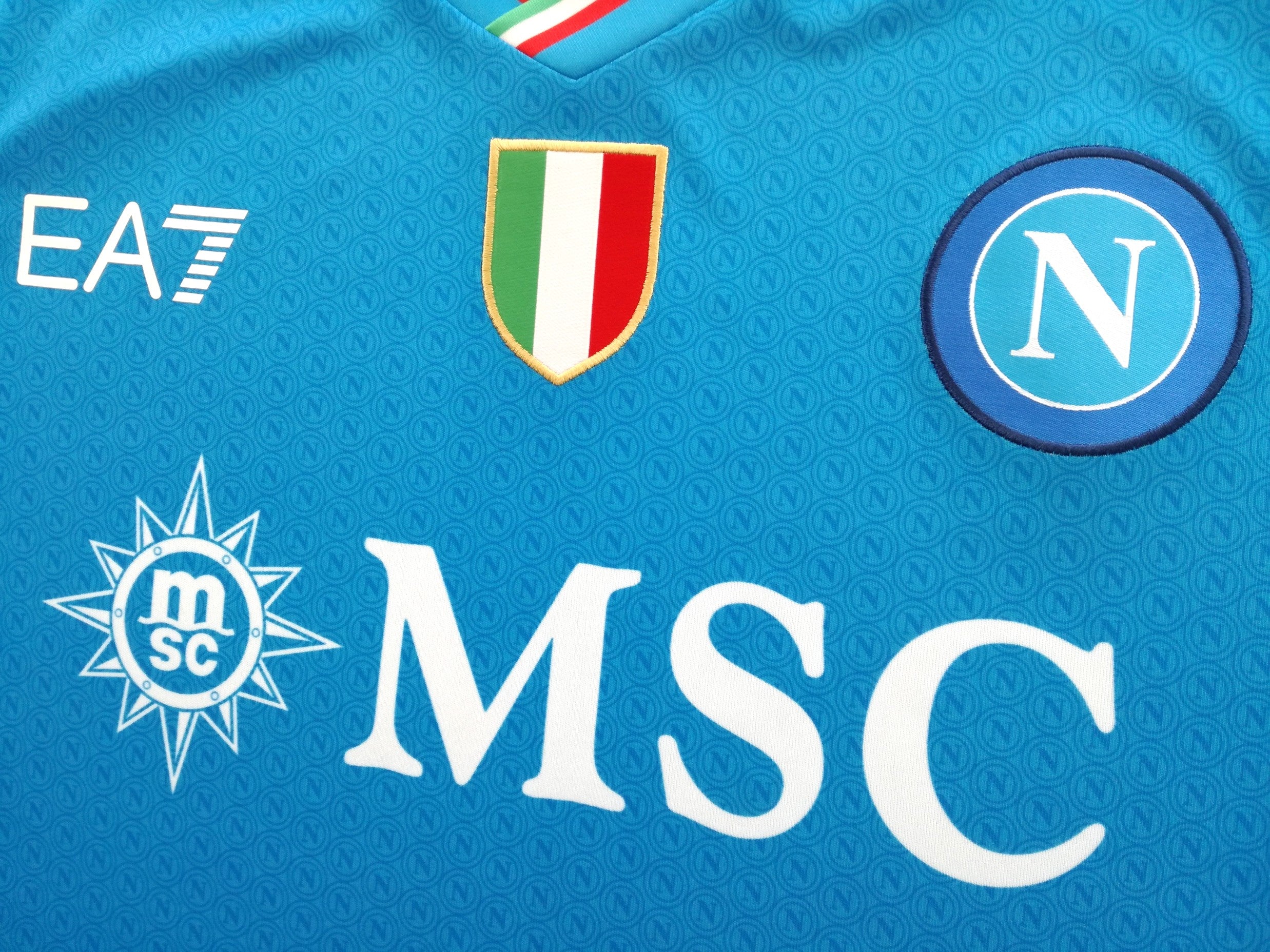 Official EA7 Napoli home football shirt from the 2023/24 season. Complete with the Scudetto shield (Serie A champions) printed on the chest.